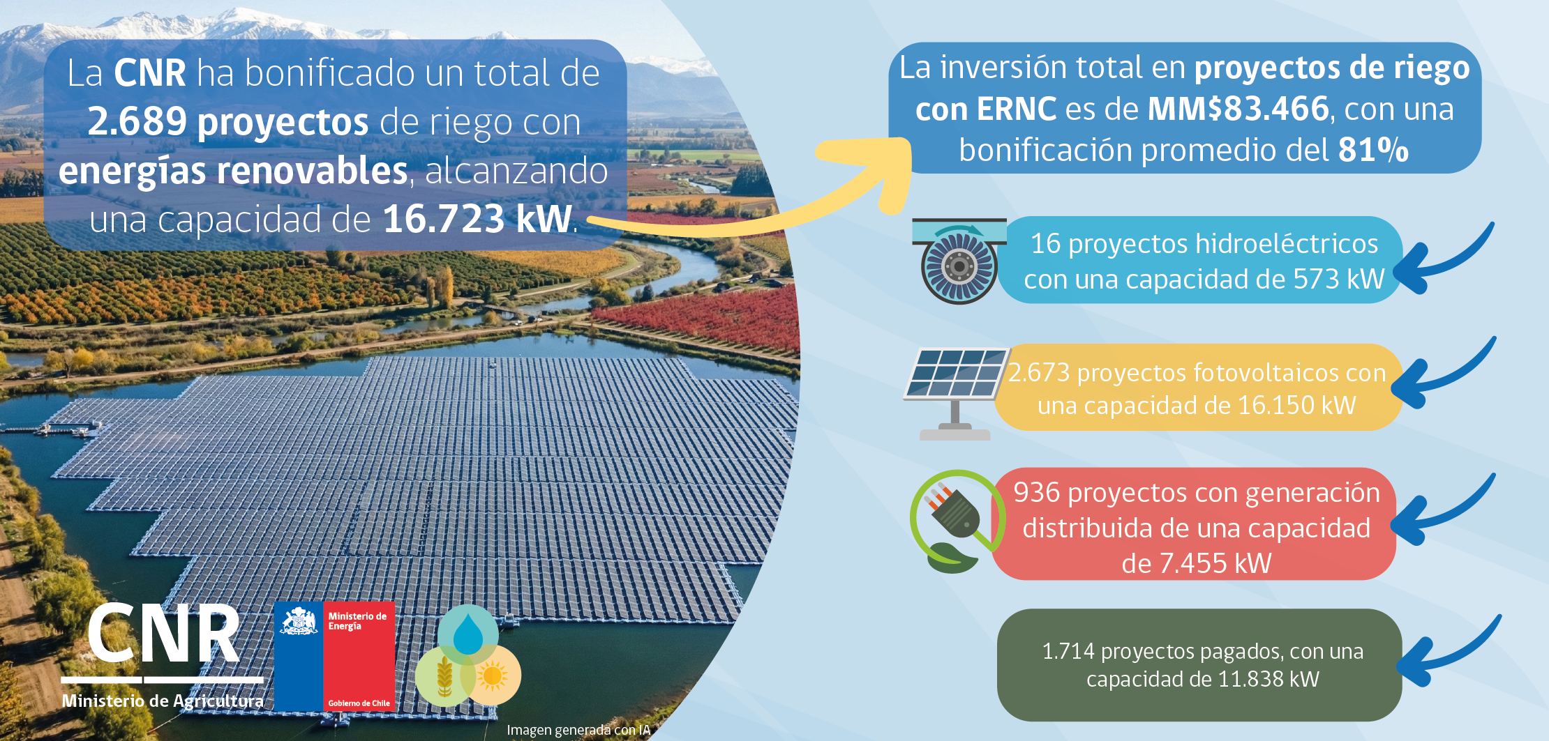Programa de trabajo entre la CNR y el Ministerio de Energía para fomentar el uso de las energías sostenibles, tales como Energías Renovables y Eficiencia Energética en proyectos de riego en el marco de la Ley Nº 18.450, junto con realizar acciones para el desarrollo de la generación distribuida en el sector agrícola mediante inversión pública.
